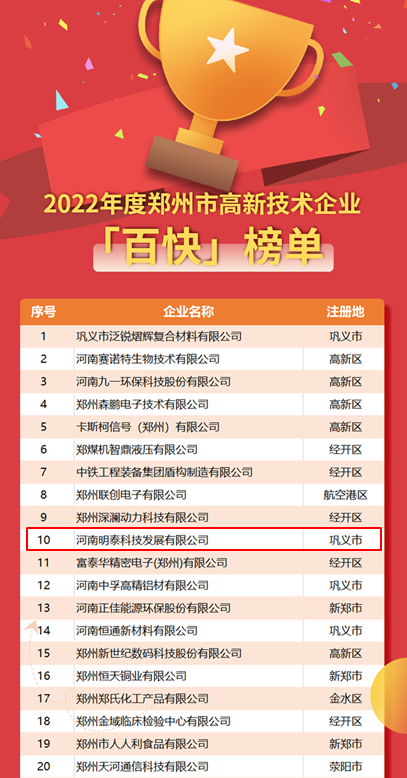12月29日,鄭州市科學(xué)技術(shù)情報(bào)研究所發(fā)布2022年度鄭州市高新技術(shù)企業(yè)“雙百”榜單,集團(tuán)子公司河南明泰科技發(fā)展有限公司作為“老牌”國(guó)家高新技術(shù)企業(yè)榮登榜單。